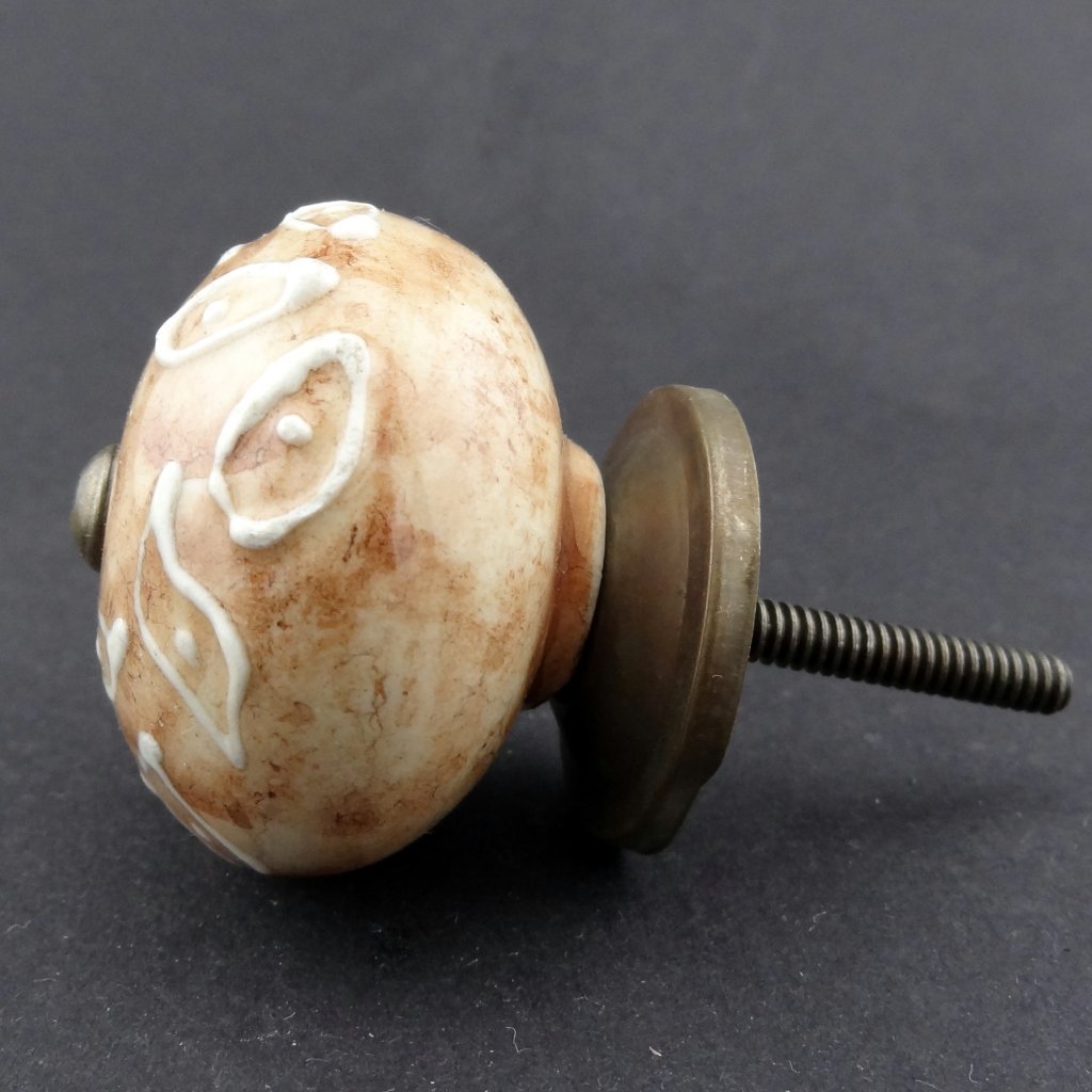 Keramická nábytková úchytka hnědobílá s plastickým vzorem. Pozor- každá úchytka je malinko jiná v závislosti na vzoru.
