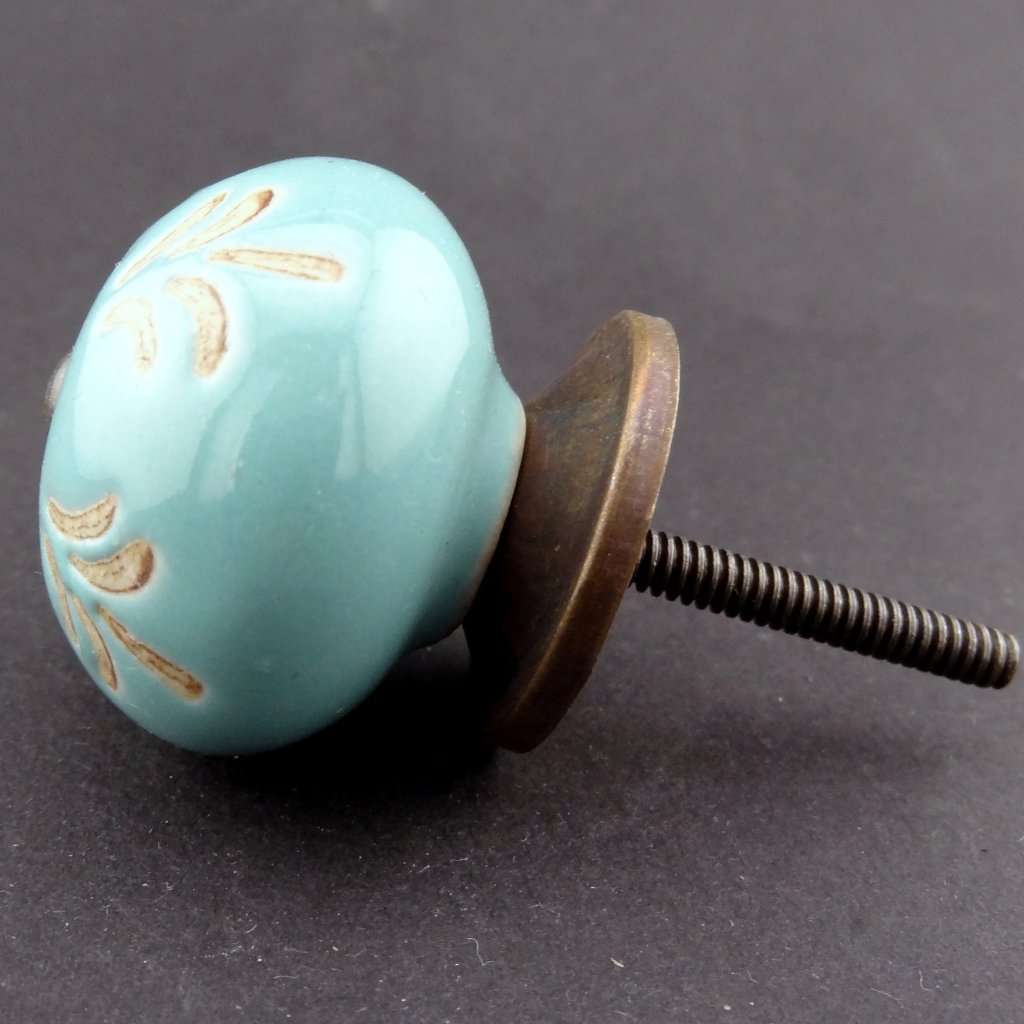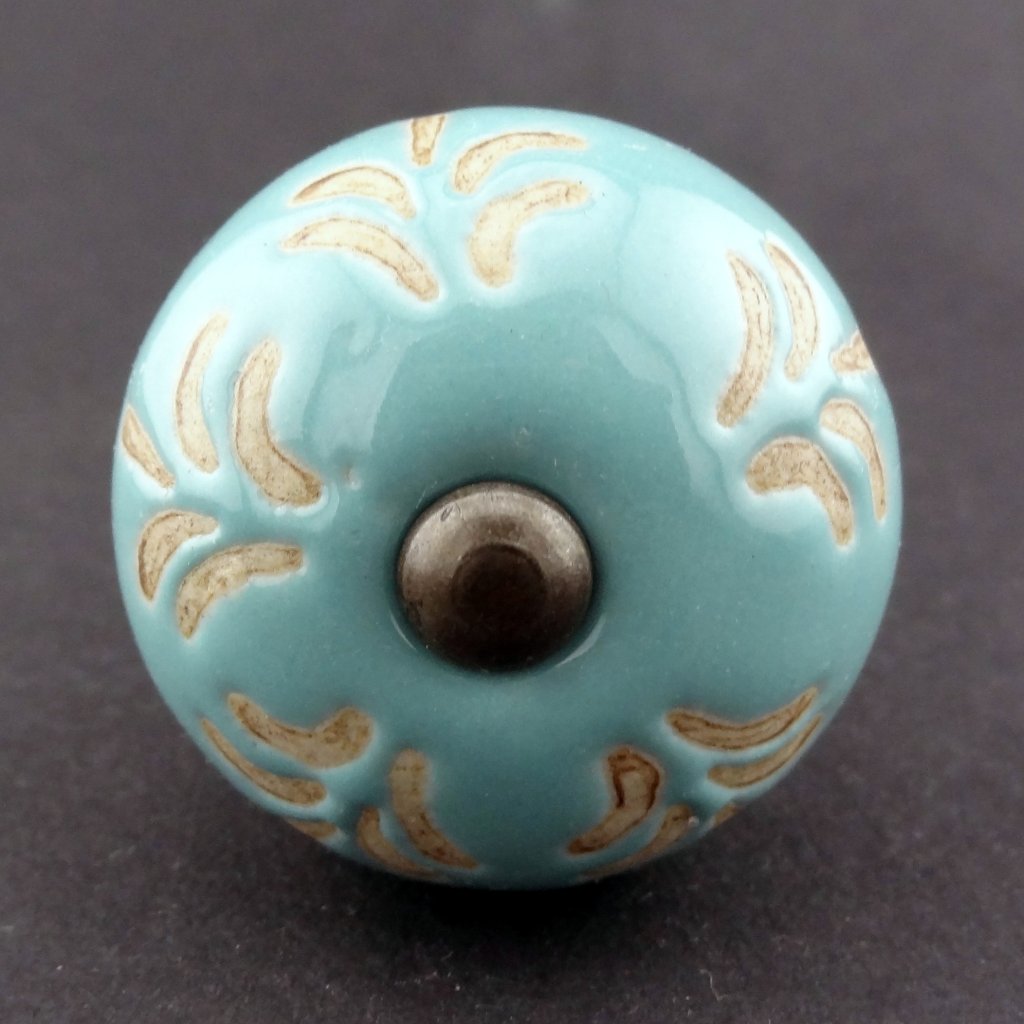 Keramická nábytková úchytka světle tyrkysová s hnědým neglazovaným vzorem.
