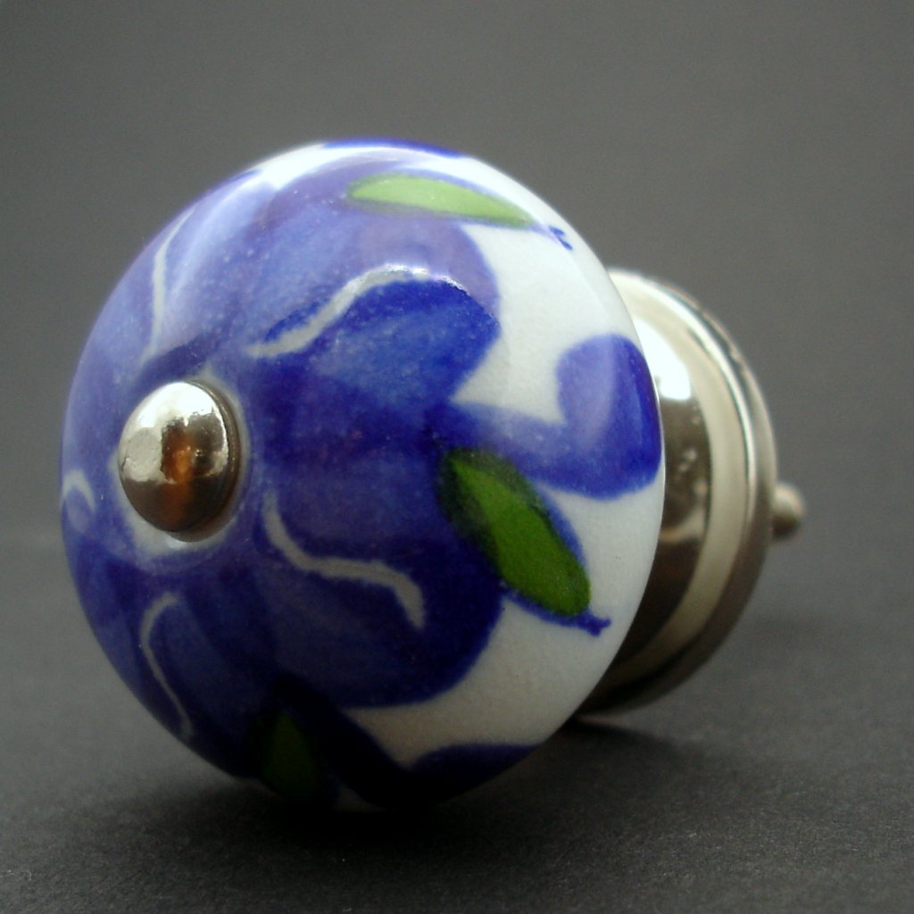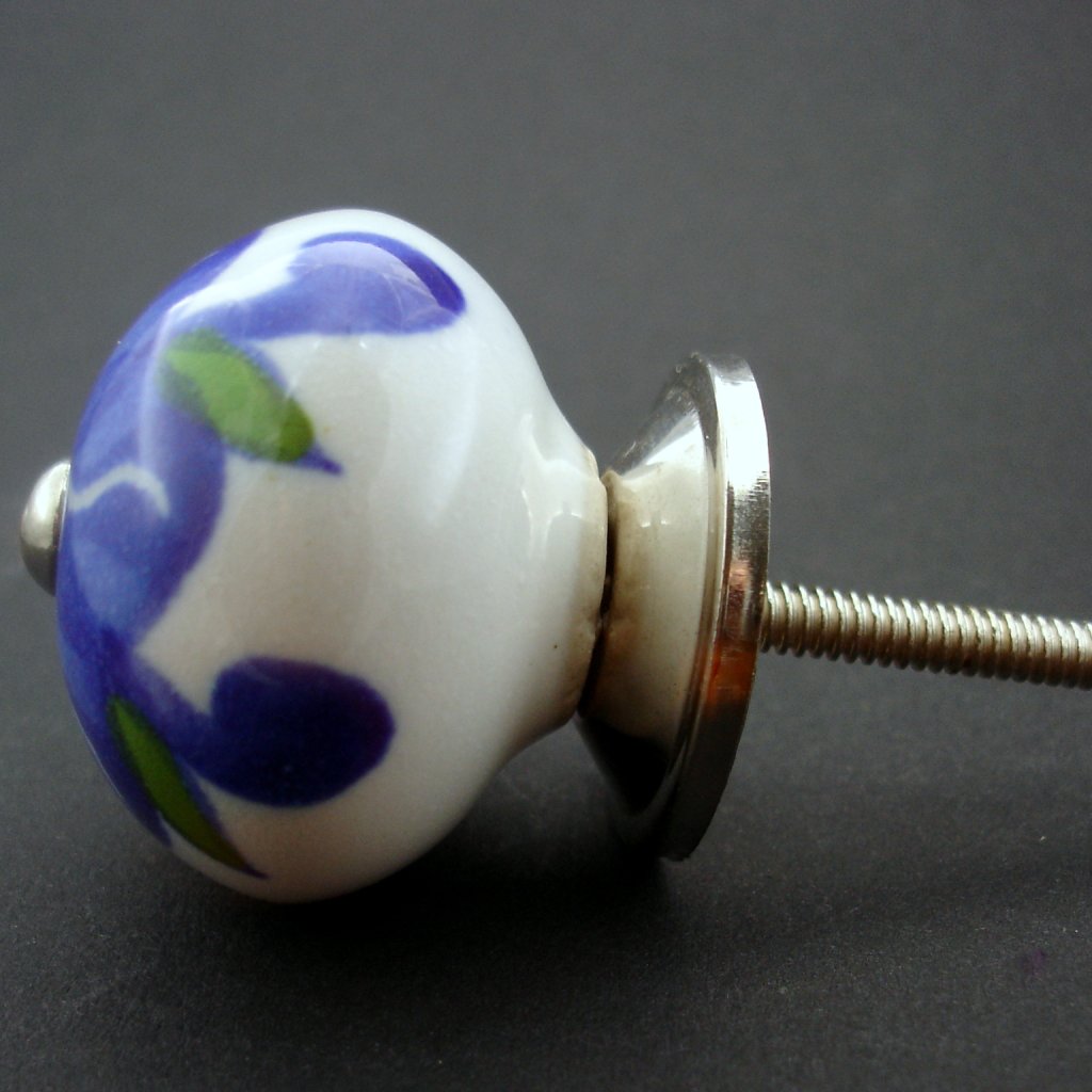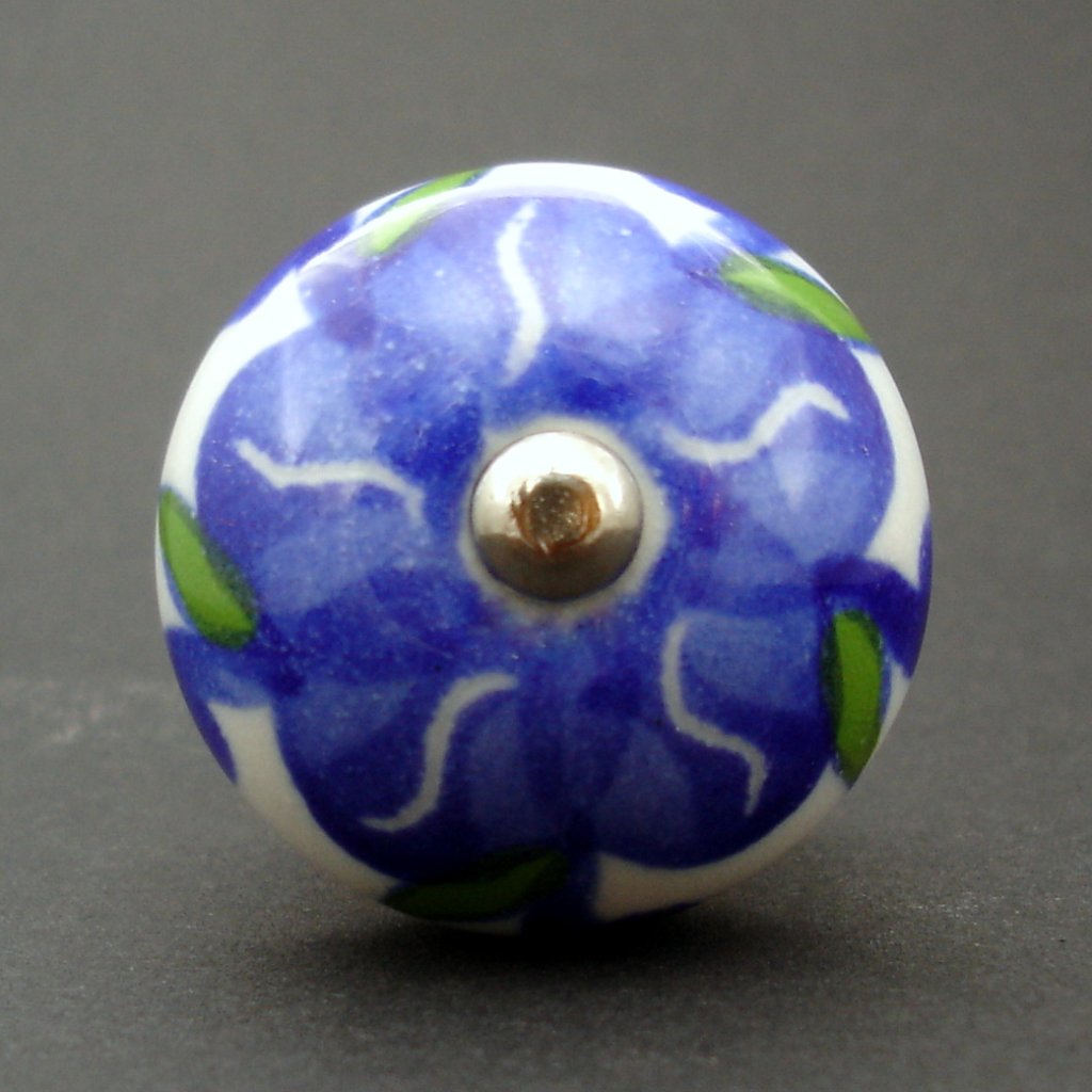 Keramická nábytková úchytka. Ručně malovaný velký modrý květ na bílém úchytu.