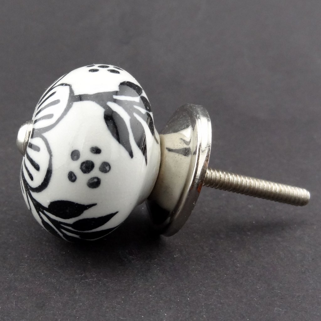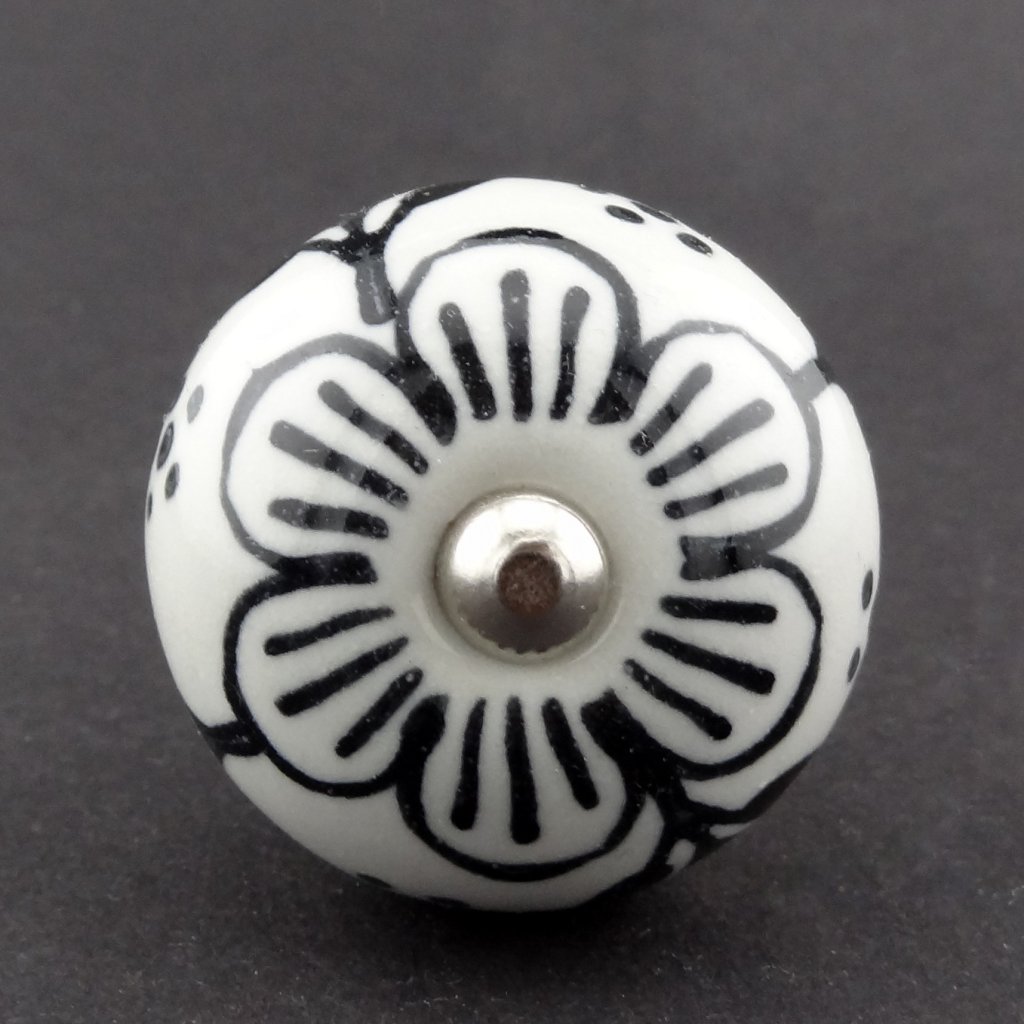 Keramická nábytková úchytka s ručně malovaným černým květem na bílém podkladu.