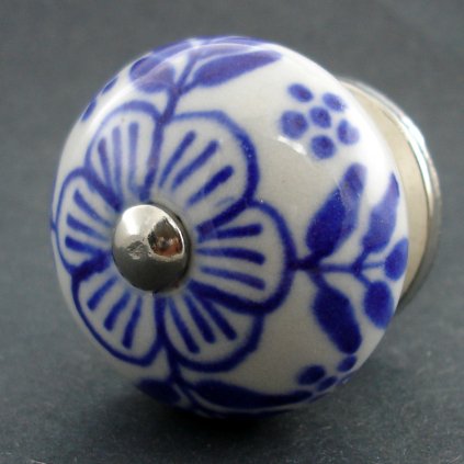 Keramická nábytková úchytka s ručně malovaným modrým květem na krémovém podkladu.