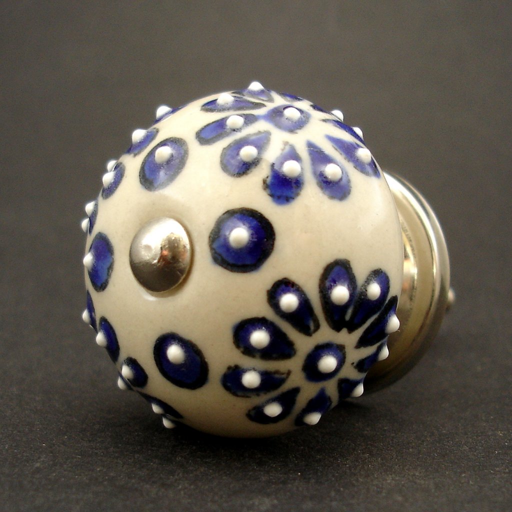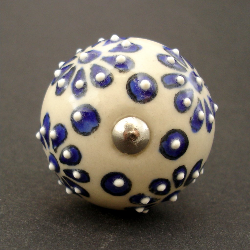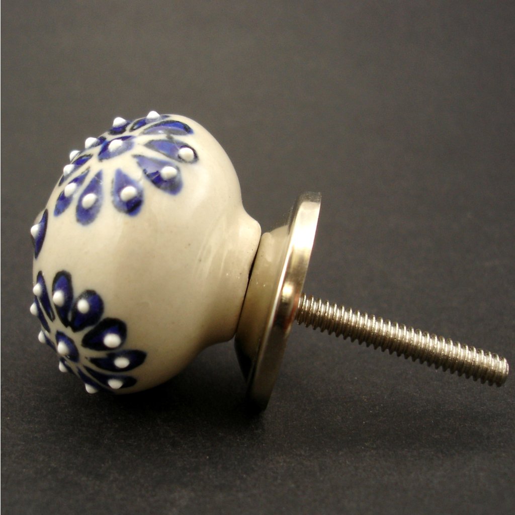 Keramická nábytková úchytka. Ručně malované modré květy na krémovém úchytu, zdobeno bílými plastickými puntíky.