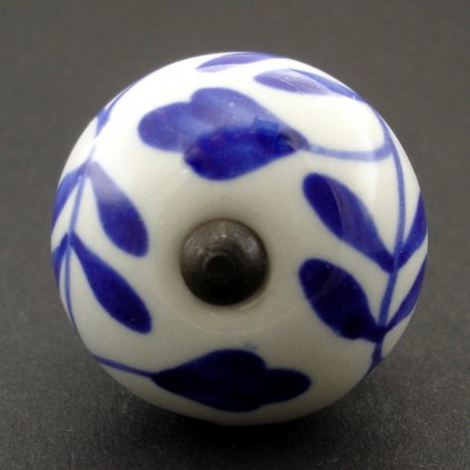 Keramická nábytková úchytka s ručně malovaným modrým vzorem.