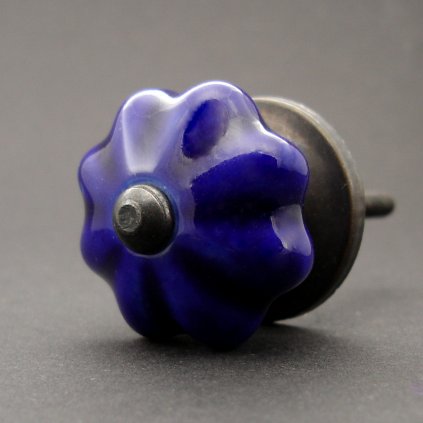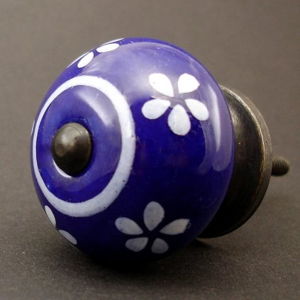 Keramická nábytková úchytka s ručně malovanými modrými srdíčky s puntíky.